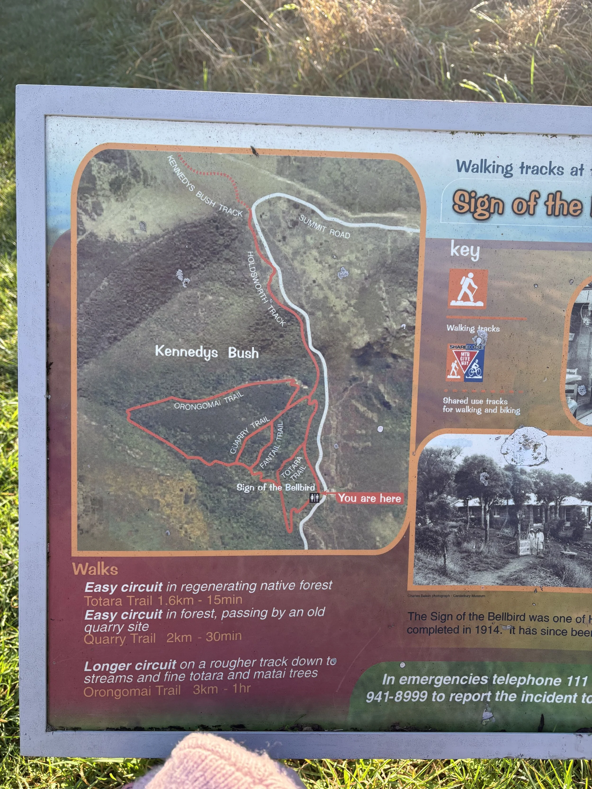 Parking: Sealed parking on the harbour side of Summit Road near the Sign of the Bellbird. Cross the road to reach the trailhead, where there is a basic map on a sign for all the tracks.